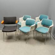Vier kunststof eetkamerstoelen met stoffen bekleding en metalen frame, model 2225, ontwerp André Cordemeyer, uitvoering Gispen -gebruikssporen en defecten, twee schroeven van één stoel ontbreken-, daarbij: metalen armstoel met gestoffeerde rug en zitting, model 1268, ontwerp André Cordemeyer, uitvoering Gispen -gebruikssporen, bekleding sleets-, 79 x 61 x 45 cm