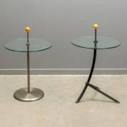 Twee bijzettafeltjes met glazen blad en handvat met houten bol, jaren '80/'90 -gebruikssporen-, 75 x Ø48 cm