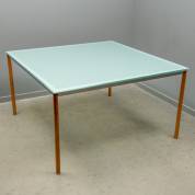 Vierkante tafel met mat glazen blad en metalen onderstel met houten poten, modern, 72 x 130 x 130 cm