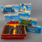 Playmobil elektrische grote treinset in doos, Art. Nr. 4000, daarbij: stationmeubilair Art. Nr. 4371, personenwagon DB, Art. Nr. 4100, veewagon, Art. Nr. 4101 en diverse rails Lehman en Playmobil