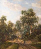Hollandse School: figuur met hond op bospad, olieverf op paneel, niet gesigneerd, 19e eeuw, 60 x 50 cm