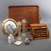 Eiken brievenkastje met roldeurtje, eiken dienblad, paar glazen kandelaars, butlerspiegeltje in messing lijst, porseleinen theebusje, twee inktpotten, en aardewerk lekschaaltje, Wedgwood