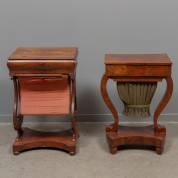Twee mahonie naaitafeltjes met wolmand, beide Hollands, biedermeier -defecten-, 75 x 49 x 38 cm