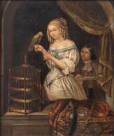 Kopie naar Casper Netscher, vrouw met papegaai, olieverf op karton, modern, 28 x 23 cm
