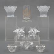 Glazen vaas met geëtst en met goudverf afgewerkt decor, ontwerp Bjorn Wiinblad, uitvoering Rosenthal, daarbij: stervormige kandelaars, uitvoering Rosenthal, waxinelichthouders, ontwerp Pertti Kallioinen, uitvoering Lasisepät Mäntsälä, Finland, en ander glas, 16,5 x Ø 8 cm