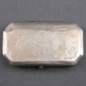 Metalen tabaksdoos met gegraveerde tekst: '18 junij Waterloo 1815-'65', met stippelgravure van een leeuw die een adelaar overmeestert -gebruikssporen-, 2,5 x 13,5 x 7 cm