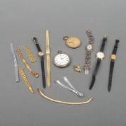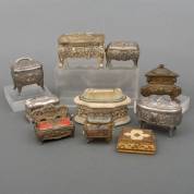 Negen diverse sieradenkistjes, waaronder: kistje met verguld frame en gefacetteerde glazen ruitjes, 19e eeuw, en metalen kistje in de vorm van een bank met kroontje in de rugleuning, daarbij: messing driehoekvormig inktpotje, neorenaissance