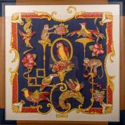 Ingelijst bedrukt zijde: vogels, apen en bloemen, gemerkt Salvatore Ferragamo, 86 x 85 cm