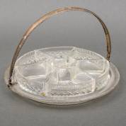 Kristallen serveerschaal met zes bakjes, voorzien van 2e gehalte zilveren hengsel met inscriptie 'Her Co' -gebruikssporen-, Ø32 20 cm