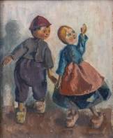 Hollandse School: dansende poppen, olieverf op schilderskarton, r.o. onduidelijk gesigneerd en gedateerd 1917, 28,5 x 23,5 cm