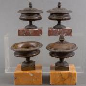 Twee paar bronzen siercoupes met deksel, alle op natuurstenen basement, 19e eeuw -één coupe staat wankel, één deksel ontbreekt-, 14 x 8 x 8 cm