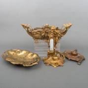 Inktstel met thermometer in goudkleurige metalen kast geflankeerd door engeltjes, koperen inktstelletje met florale motieven, goudkleurige metalen dienblad en jardinière -binnenbak ontbreekt-, alle art nouveau-stijl