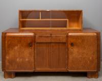 Dressoir met vitrineopstand, het geheel gefineerd met diverse houtsoorten, de onderkast met drie lades, vier deurtjes en marmeren uitschuifblad, Duitsland, jaren '30 -lakwerk ietwat sleets-, 145 x 200 x 62 cm