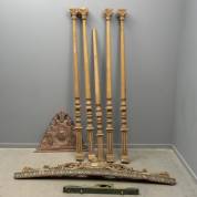 Drie gestoken en gesneden houten ornamenten, daarbij: vijf pilaren van een hemelbed -gebruikssporen, lichte beschadigingen en missende onderdelen-, 207 x 12 x 12 cm