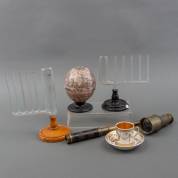 Struisvogelei met afbeelding van de walvisvaart, daarbij: laboratoriumglas, twee verrekijkers en kop-en-schotel, 17 x Ø 12 cm
