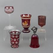 Drie rode überfang kristallen glazen op voet, waterglas en rode kristallen tafelbel, 19e/20e eeuw -één glas met chip-, 19 x Ø 7,5 cm