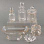 Zevendelige glazen toilettafelset met gouden biezen -verguldsel sleets, kleine defecten-, 17 x Ø 6,5 cm