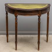 Mahoniegefineerd wandmeubel met lade, het blad bekleed met groen leder, staand op gecanneleerde poten, modern -gebruikssporen-, 75 x 84 x 42 cm