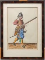 Ingekleurde gravure: musketier, reproductie uit 'Wapenhandelinghe Van Roers. Mvsqvetten. Ende Spiessen.' maar vermoedelijk van later datum, 26 x 18 cm