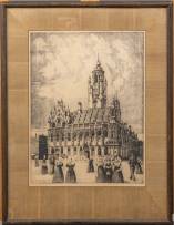 Laurens Jannis Braams (1913-1997), gezicht op het stadhuis van Middelburg met vrouwen in klederdracht, ets 15/150, r.o. gesigneerd en gedateerd '43, 40 x 30 cm
