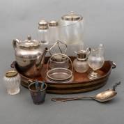 Draadglazen koekdoos, twee theebussen, twee roomkannen, waarvan één op 2e gehalte voet, twee suikerschaaltjes, lepelvaasje, nikkelen theepot, gekuipt mahonie dienblad, etc.