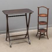 Mahonie klaptafeltje en drielaagse etagère, 20e eeuw -gebruikssporen, slijtage-, 74 x 61 x 38 cm