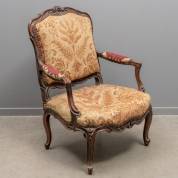 Brede notenhouten armstoel, Louis Quinze -stoffering aan vervanging toe, zitting doorgezakt-, 102 x 75 x 55 cm