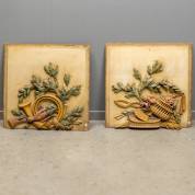 Paar houtsnijwerken: hoorn met duif, en bloemenvaas, 63 x 62 x 2 cm