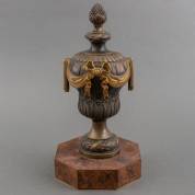 Bronzen urnvormig ornament op wortelnotengefineerde voet, 37 x 19 x 19 cm