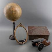 Gipsen globe, met koper bekleedde doos met opschrift 'Slippers', ovaal staand spiegeltje in gouden striklijst -stukje lijst defect-, en gietijzeren tafelkanonnetje