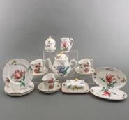 Aardewerk serviesgedeelte met polychroom bloemdecor, 'Bouquet', uitvoering Villeroy & Boch, modern, bestaande uit: theepot, zes kop-en-schotels, roomstel, vier bordjes, twee ovale schaaltjes, en een botervloot -gebruikssporen-, 19 x 23 x 14 cm