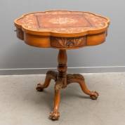 Gecontourneerde houten drum table, beschilderd met floraal decor, staand op driespantpoot -lichte gebruikssporen-, 78 x 81 x 81 cm