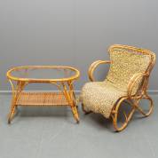 Rotan armstoeltje met kussen, en salontafeltje met glazen blad en etagère, jaren '60, 73 x 62 x 70 cm