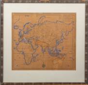 Gravure met ingekleurde contouren: 'Nieuwe kaart van het oostelijkste deel der weereld', uitgegeven door Isaak Tirion, Amsterdam, 1753 -papier geheel verbruind-, 33 x 37 cm