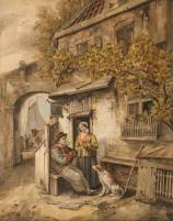Hollandse School: figuren in deuropening, aquarel, r.o. gesigneerd J. de Haart, 35 x 28 cm