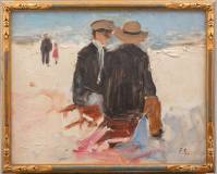 Hollandse School: twee heren op het strand, olieverf op paneel, r.o. gemonogrammeerd F.S., eerste helft 20e eeuw, 22,5 x 29 cm