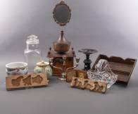 Divers kleingoed, waaronder: bestekbak, grote glazen snoeppot, natuurstenen tazza, geslepen glazen mand, verzilverde kandelaar, 45 x 29 x 29 cm