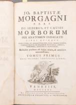 Boek: Pathologie - Morgagni, Giovanni Battista (Forli 1682-1771 Padua). De sedibus et causis morborum per anatomen indagatis libri V. Venetiis, ex typogr. Remondiniana, 1761. 2 delen. In 1 band. XCVI, 298; 452 pp., tekst in 2 kolommen. Folio. Half kalfsleer, rug verguld. Met portret. Eerste druk van het 'standaardwerk van anatomopathologie aan westerse universiteiten tot in de 19de eeuw' -het papier op de platten ontbreekt-, 37 x 24 cm