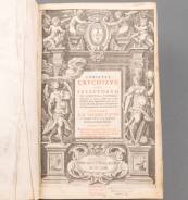 Boek: Pinto, I. (S.J.) Christus crucifix, sive selectorum ex Scriptura universa & Crucifixus quot sunt crusis dimensiones et Cornua. 2 delen in één band. Lugdini, Cl. Landrus, Cl. Du-four, 1624-1644. Folio. Blindgestempeld perkament. Met gegraveerde titel -bovenste scharnier van de band gespleten, stempels op de gegraveerde titel-, 38 x 45 x 14 cm