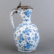 Delfts aardewerk wijnkannetje met tinnen deksel, de licht getorste buik met blauw-wit bloemdecor, midden 17e eeuw -glazuurschilfers, randbeschadigingen, tinnen bandje rond oor gebroken-, 23 x 13 x 11 cm