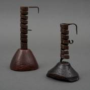 Twee ijzeren spiraalvormige 'rat de cave' kandelaars op houten voet, West-Europa, 19e eeuw, 22 x Ø 10 cm