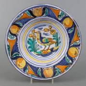 Majolica schotel met polychroom vogel- en vruchtendecor, Spanje, 18e eeuw -randchips-