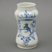 Aardewerk albarello, het decor met staande leeuw, Spanje, 18e eeuw -defecten-, 22 x Ø 13 cm