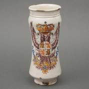 Aardewerk albarello met polychroom wapenschild van Castile en Leon, Spanje, 18e/19e eeuw -defecten-, 27,5 x Ø 13 cm