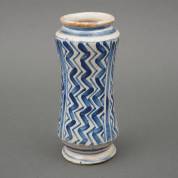 Aardewerk albarello met blauw geometrisch decor, 18e/19e eeuw -defecten-, 26 x Ø 11,5 cm