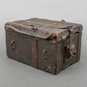 Met bewerkt leder bekleed eiken kistje voorzien van smeedijzer beslag, 17e/18e eeuw -gebruikssporen-, 24 x 25 x 18 cm