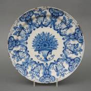 Delfts aardewerk schotel met blauw-wit decor: bloemenmand in het plat omgeven door fruitmanden, uitvoering De Witte Starre, 18e eeuw -randchips-, 5 x Ø 35 cm
