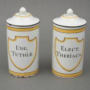 Paar aardewerk bedekte apothekerspotten met opschrift: 'Ung. Tuthiae' en 'Elect. Theriaca', 19e eeuw -defecten-, 22 x Ø 11 cm