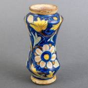 Aardewerk albarello met polychroom bloemdecor, Italië, mogelijk Sicilië, 17e eeuw -enkele chipjes en schilfers-, 18 x Ø8 cm
