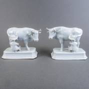 Paar Delfts wit aardewerk beelden: boer melkt koe, 18e eeuw -restauraties en enkele kleine defecten-, 19 x 22 x 12 cm